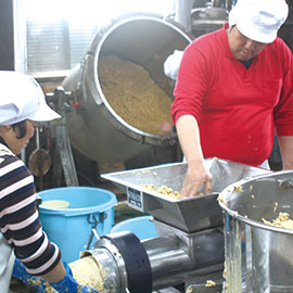 煮て柔らかくなった大豆を機械で潰していきます。