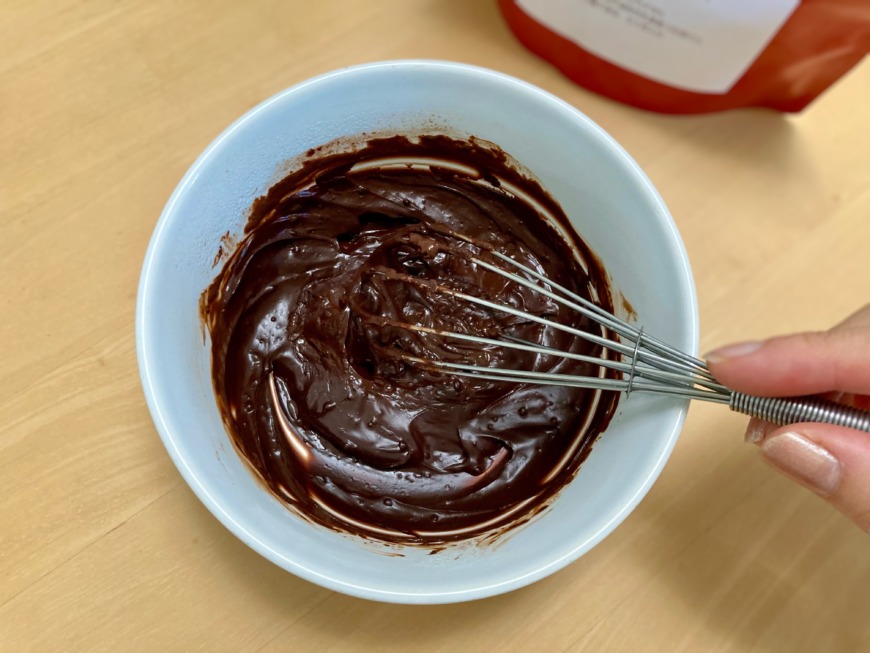 美ココア大さじ3と牛乳大さじ5をよく混ぜ、電子レンジで約1分加熱するだけで、なめらかなチョコレートソースが完成しました。