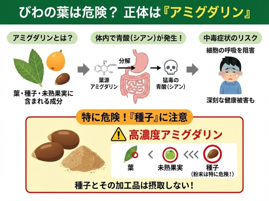 びわの葉や種子に含まれる「アミグダリン」は、体内で青酸を発生させ中毒症状を引き起こす可能性があり、特に「種子」はリスクが非常に高いです。「がんに効く」という情報に科学的根拠はなく、農林水産省なども注意喚起しています。