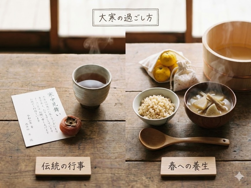大寒の時期に行われる伝統行事や、体を温めて春に備えるための養生法について解説します。