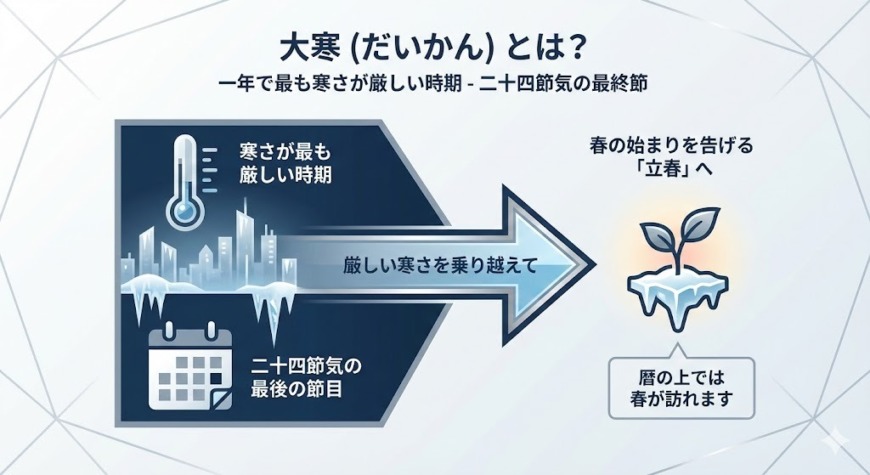 大寒は「だいかん」と読み、一年を24の季節に分けた二十四節気における最後の節目です。その名の通り、一年の中で寒さが最も厳しくなる時期とされています。この厳しい寒さを乗り越えると、暦の上では春の始まりを告げる「立春」が訪れます。