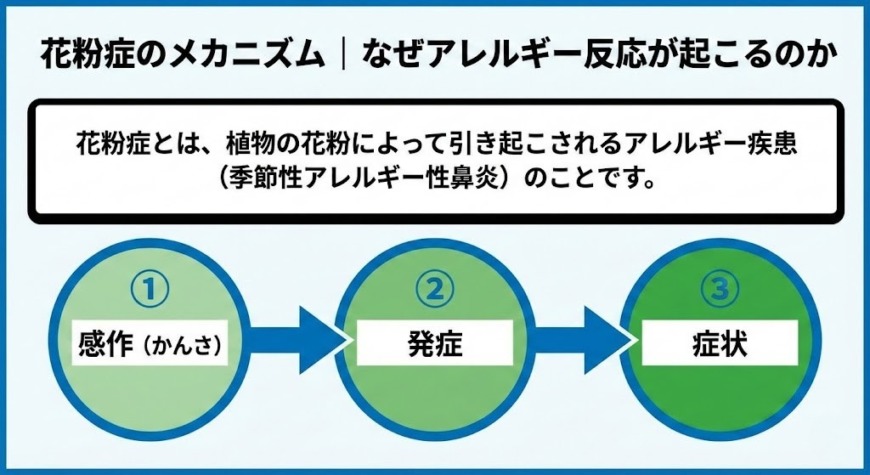花粉症の発症には、まず「感作(かんさ)」と呼ばれる、体が花粉に慣れてアレルギー反応を起こす準備をする期間を経て、実際に症状が出るようになります。