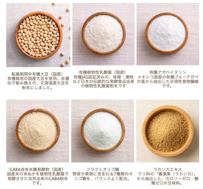一般的なソイプロテインによくある脱脂加工ではなく、大豆そのものを活かしているため、たんぱく質だけでなく、大豆イソフラボンやトリプトファンなどの栄養も一緒に摂れるのが特長です。