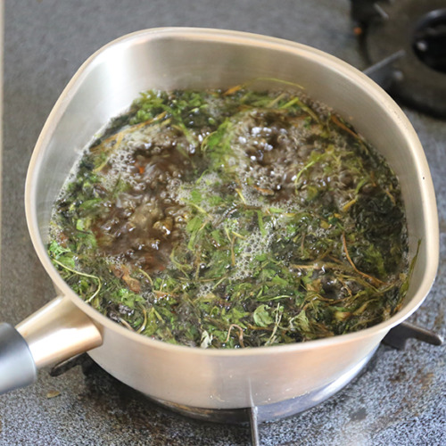 - 2によもぎを入れ、再度沸騰するまで待ちます。