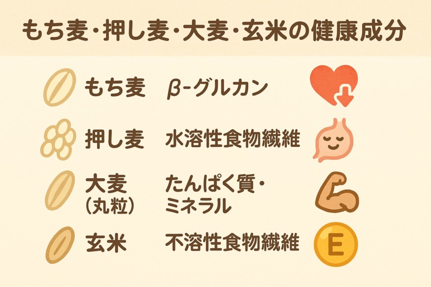 もち麦・大麦・押し麦・玄米の健康成分の比較