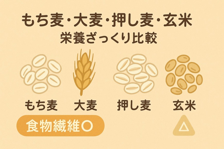 エネルギーと三大栄養素は4品とも近い水準ですが、食物繊維量は大麦系(特にもち麦・押し麦)が突出していることがわかります。