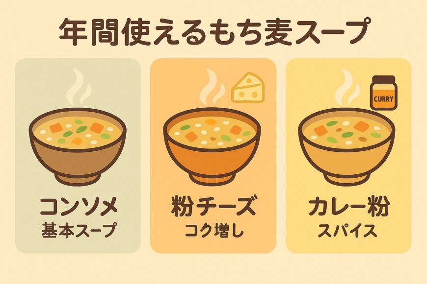 もち麦スープは、シンプルなコンソメベースで仕上げると、一年を通して手軽に楽しめる定番メニューになります。