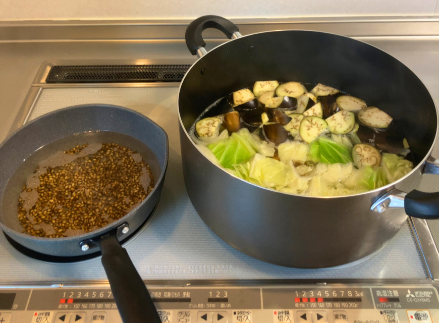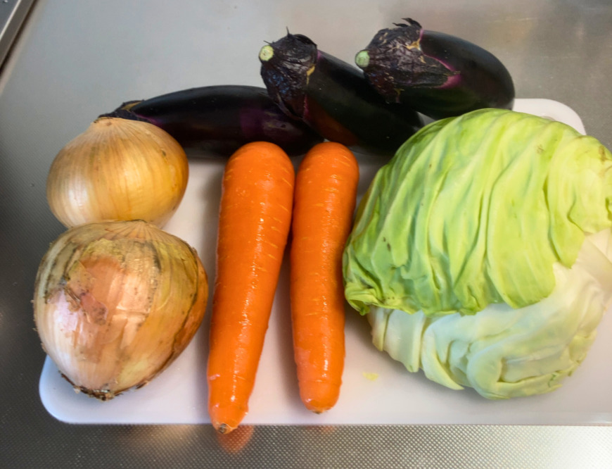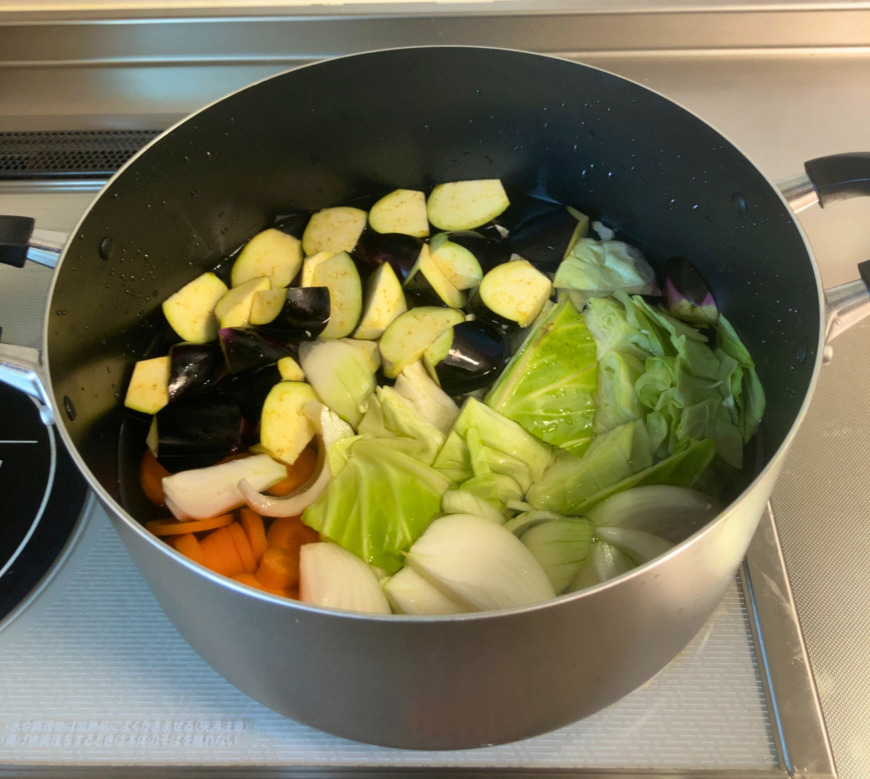 - 鍋にオリーブオイルを熱し、玉ねぎ、人参、キャベツ、なすの順で炒めます。