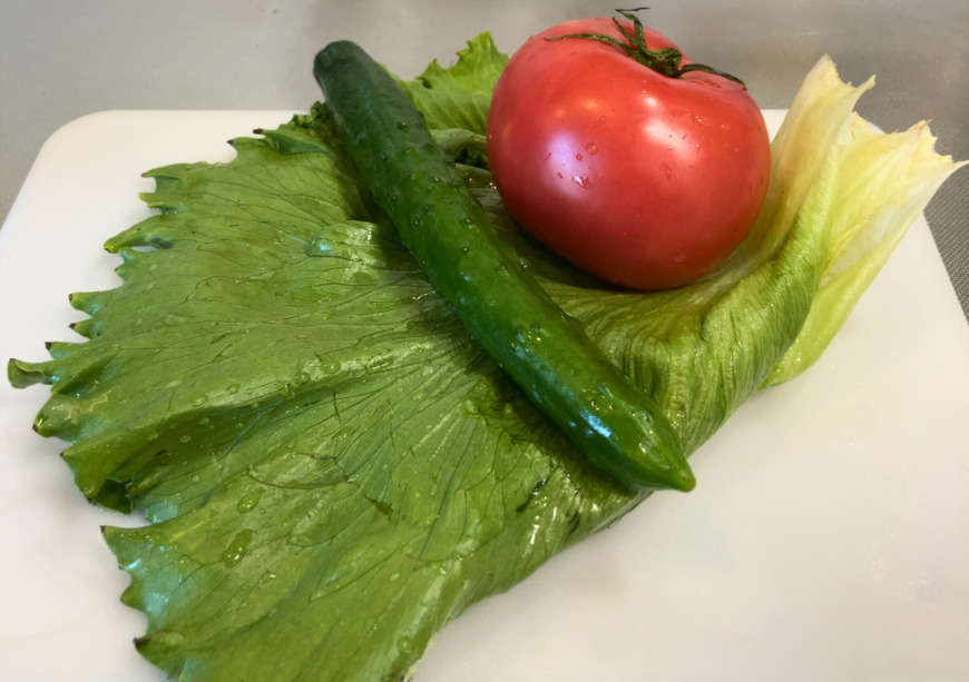 今回手元にミックスナッツとくるみがなかったので、簡単にトマトとキュウリ、レタスでサラダを作っていきます。
